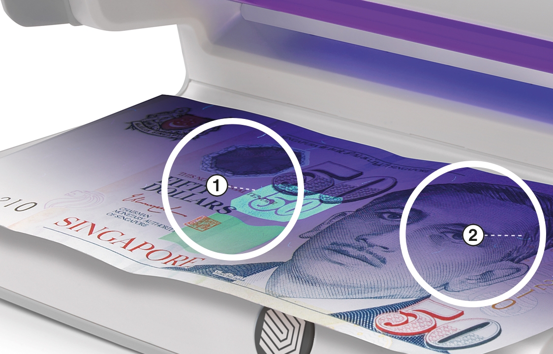 Every modern banknote contains ultraviolet (UV) ink with fluorescent phosphors that cannot be seen in daylight ①, but are clearly visible under UV light at a wavelength of 365 nanometers. UV detectors like the Safescan 40, 50 and 70 let you place a bill under a bulb emitting UV light at the correct wavelength and visually verify that it contains UV marks ②. Higher-end detectors such as the Safescan 2600 series automatically identify the UV features in modern banknotes using sophisticated UV and photonics sensors.