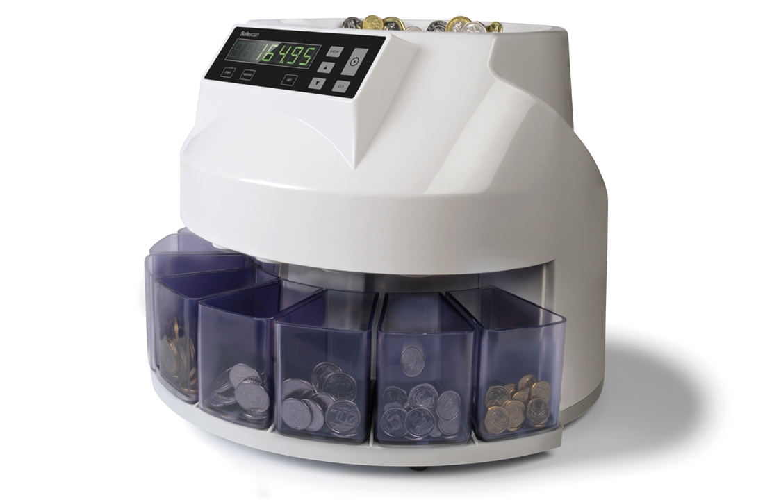 Coin counters use physical or optical sensors to tally each coin as it passes by. For example, the Safescan 1250 uses a robust dual optical sensor system—one sensor pair per coin type—to count each coin as it falls into the appropriate cup. Each tally is stored separately in device memory for later use and review