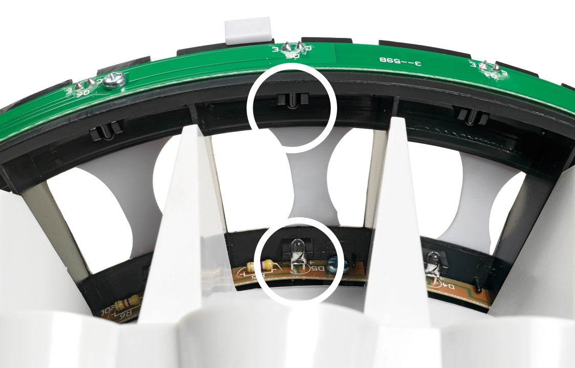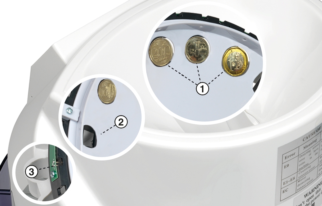 In any given currency, each coin type has its own unique diameter and thickness ➀. Mixed-coin counters like the Safescan 1250 use automated sensors and rotating discs ➁, ➂ to accurately separate coins based on these parameters and funnel them into different receiving cups.