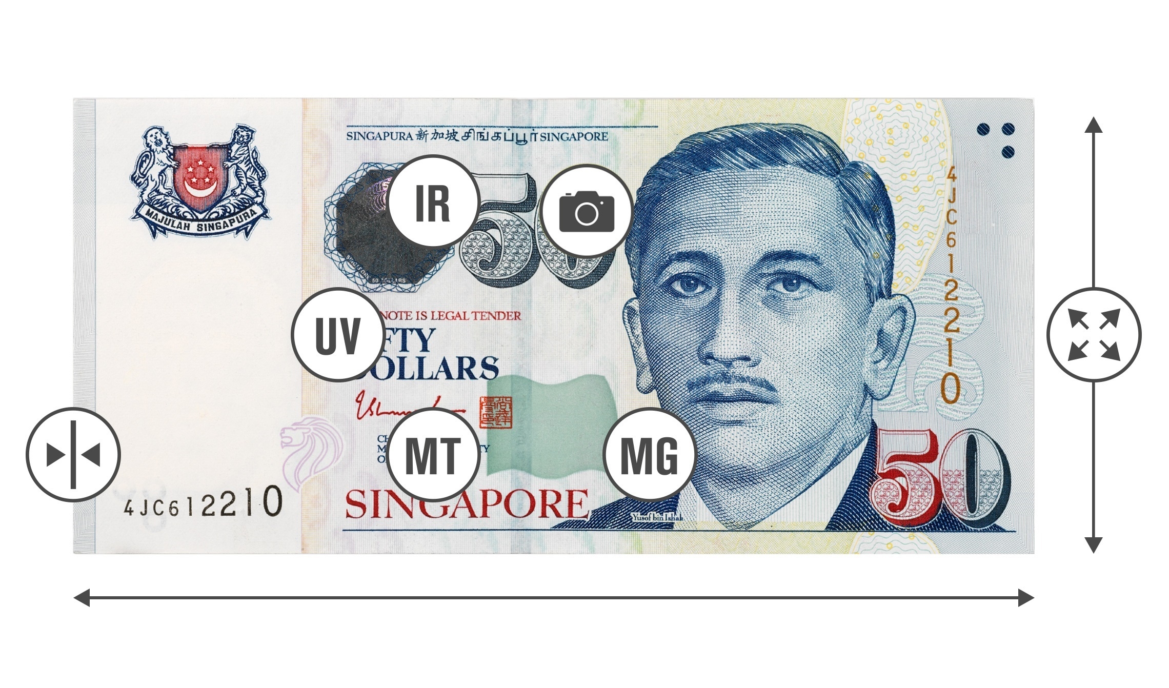 - Verifies banknotes on up to seven security features: UV, MG, MT, Infrared, Image, Size and Thickness