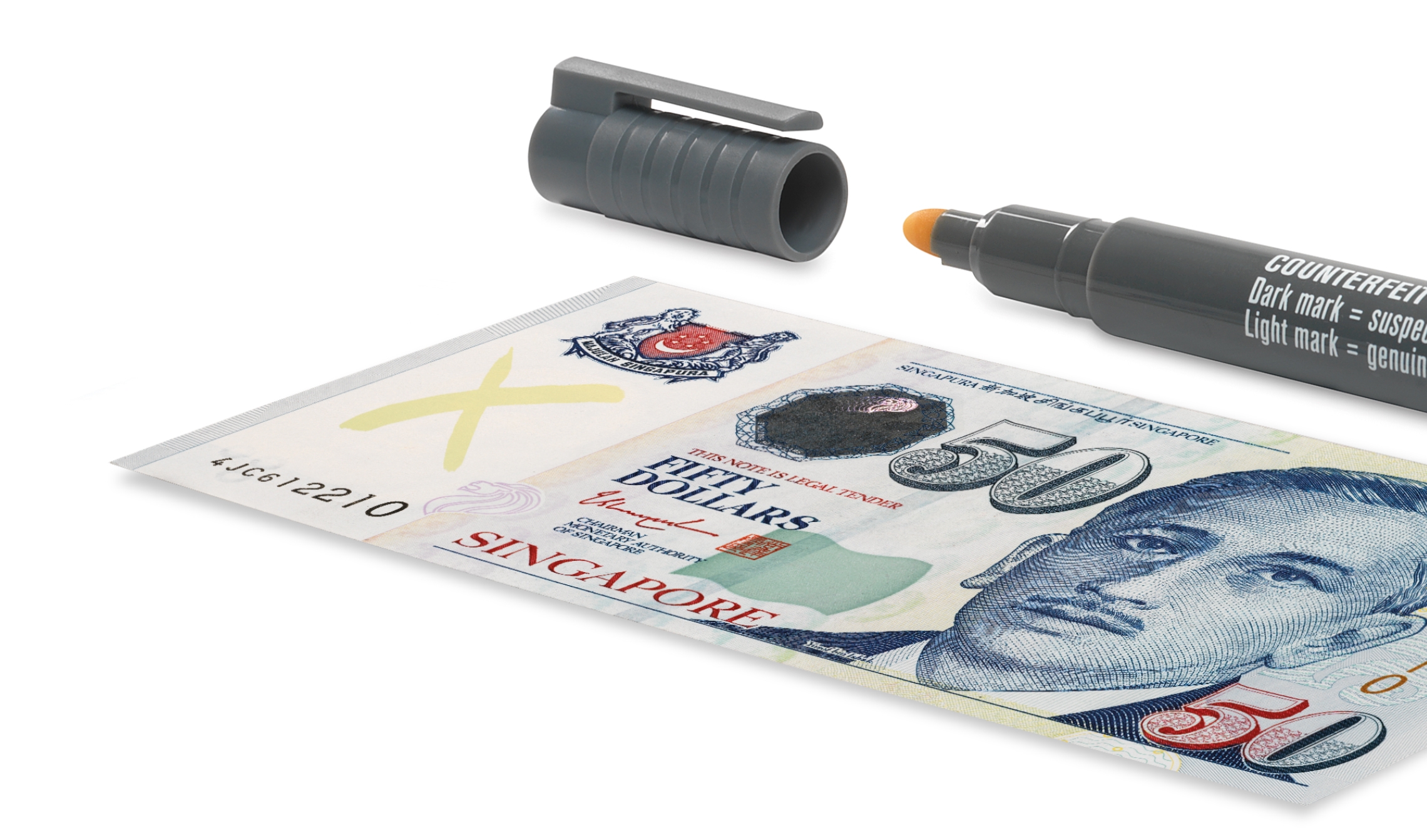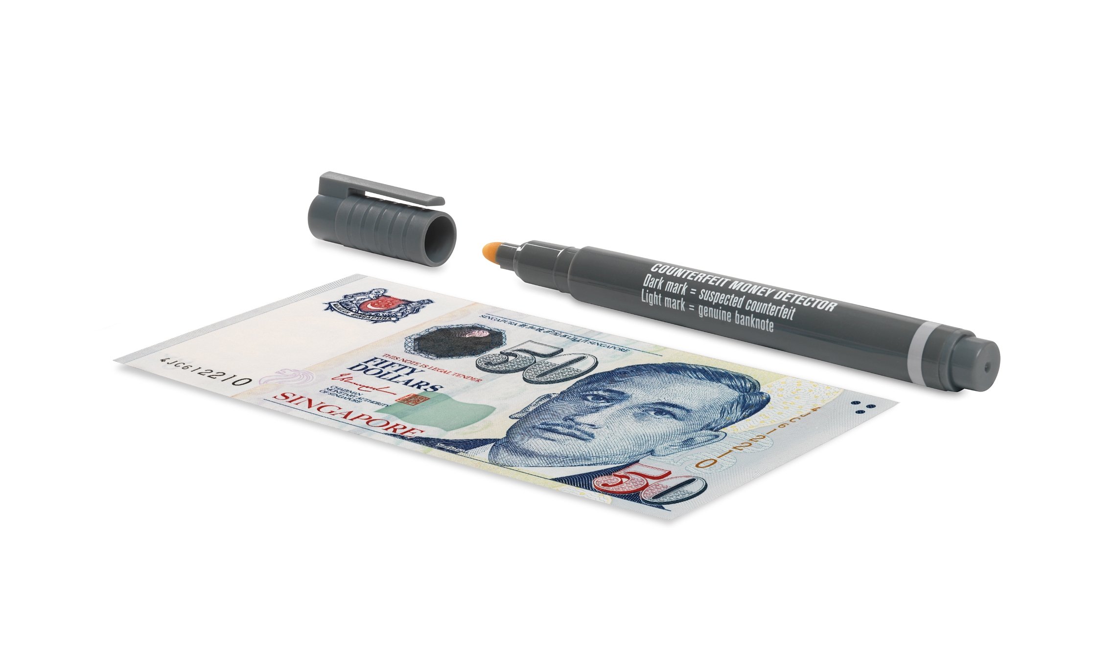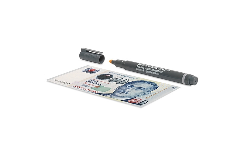 The iodine-based ink in the Safescan 30 reacts with a starch found in all standard papers, but not in the official cotton-based or polymer banknote paper used by central banks worldwide. What’s more, it helps take fake money out of circulation: the pale ink will fade away on genuine banknotes, but leave a permanent purple mark on suspected counterfeits.