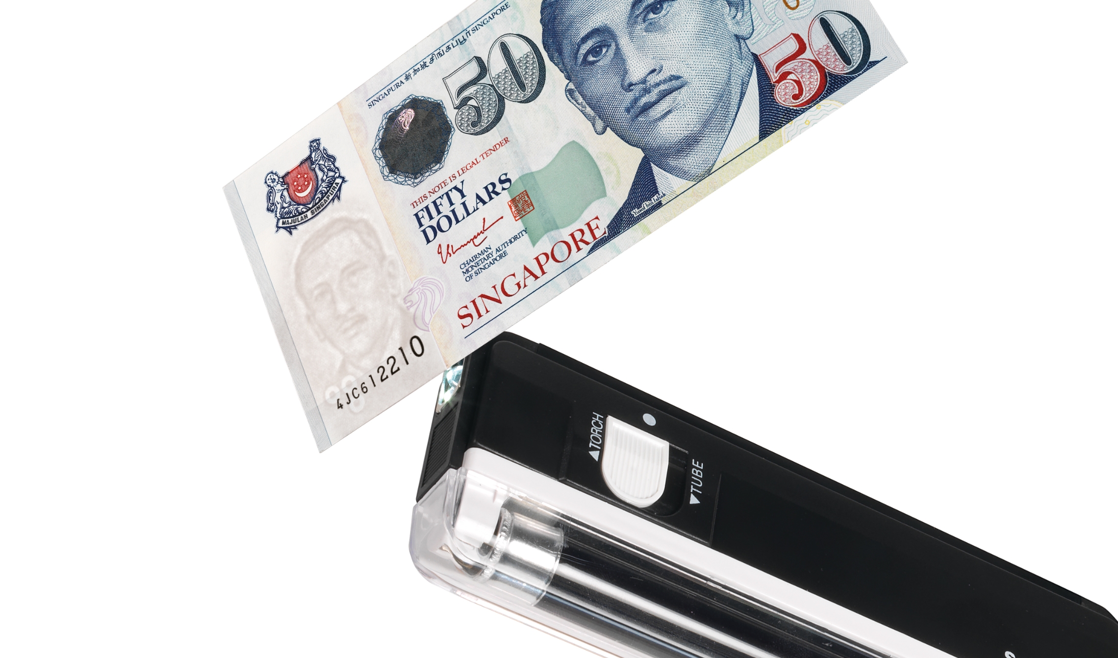 - Powerful white LED flashlight for checking watermark and security strip